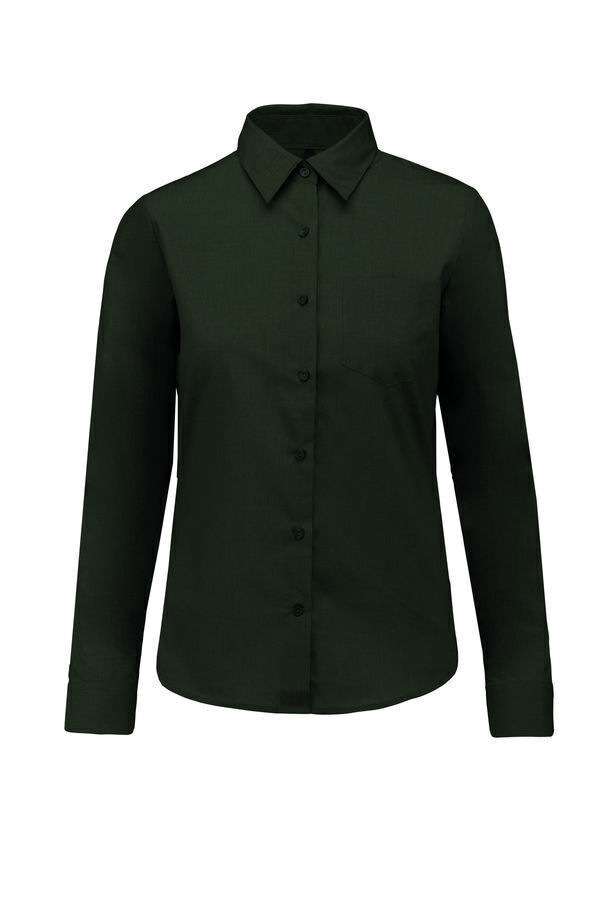 Chemise femme. Col chemise non boutonné. Boutons ton sur ton. Poche poitrine côté gauche en V. Poignet réglable à angles arrondis avec patte de manche indéchirable. 1 bouton de rappel. Bas arrondi.