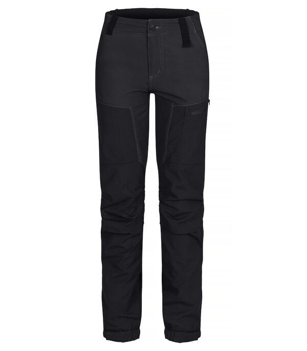 Pantalon femme bi-matière. Ceinture élastiquée et fermé par bouton. 2 poches. Genoux préformés avec poches genouillères. 2 poche zippées. Une poche zippé au dos. Bas de jambe resserrable par des Velcro® et élastiques. E.J. : 79 cm.