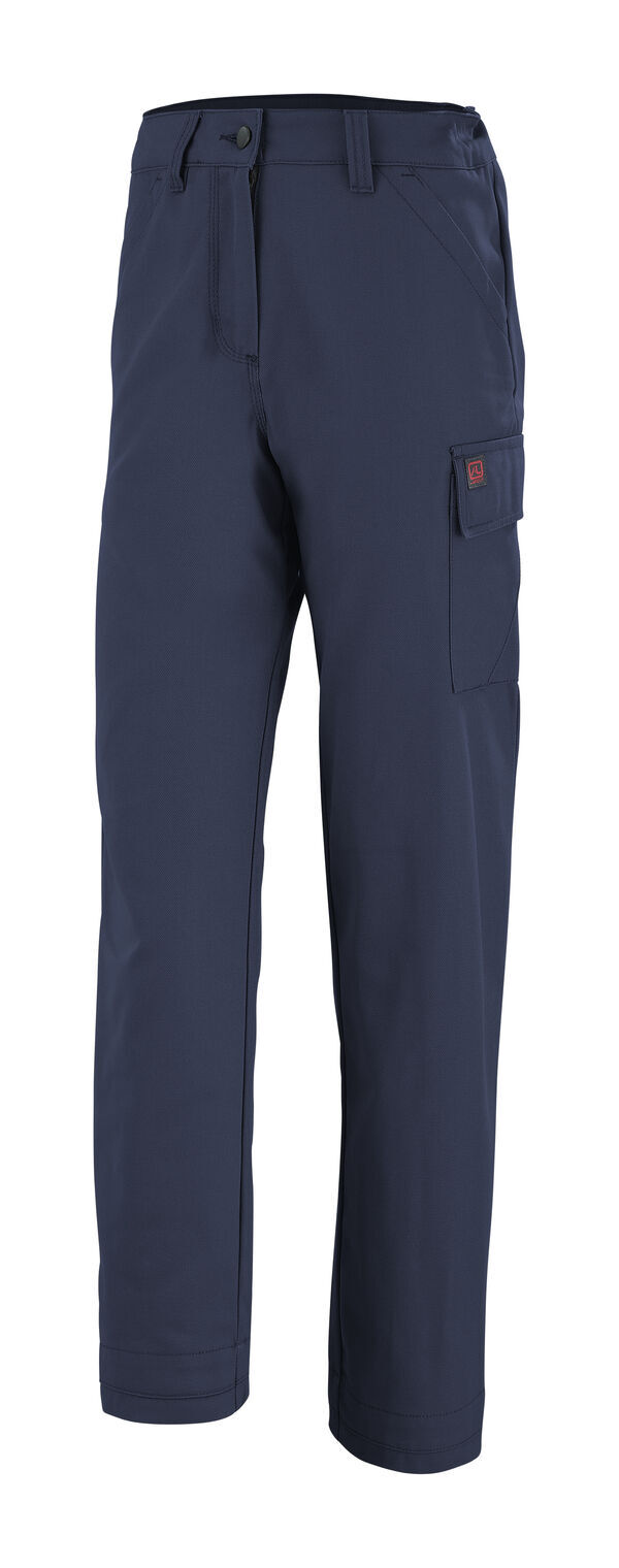 Pantalon coupe femme. Ceinture droite élastiquée côtés et fermée par bouton clou. Braguette zippée. Poches italiennes doublées. Poche revolver plaquée. Panneau d’aisance à l’entrejambe. Poche cuisse gauche avec soufflet dos sous rabat fermé par Velcro®. Poche mètre avec bas volant. Pinces jambe dos. Bas de jambes évolutifs. Surpiqûres contrastées. Mercerie tout plastique. E.J. : 78 (+ 5 cm).