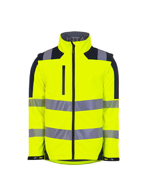 Softshell haute visibilité 3 couches. Fermeture par glissière jusqu’en haut du col avec mentonnière. Curseur réversible pour fixation à la parka KITA®. 2 poches basses, poche poitrine fermée par glissière, 2 poches intérieures fermées par auto-agrippant. Dos couvre-reins. Manches préformées et amovibles par glissière. Blouson relevé de 2 ceintures, 2 brassards et demi-bretelles rétroréfléchissantes segmentées.
