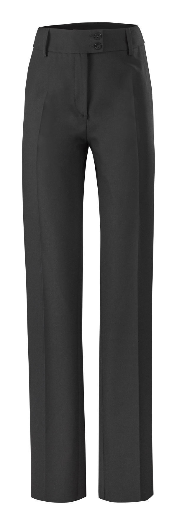 Pantalon femme taille haute. Ceinture large fermée par 2 boutons. 5 passants ceinture. 2 poches italiennes devant et 2 poches passepoilées dos avec simple passepoil, surpiqûres nervures. Plis cassés sur le milieu de jambes devant et dos. Bas intérieur ceinture terminé par un passepoil rouge. Semi-doublé devant. Bas non fini. Coupe droite. E.J. : 90 cm.