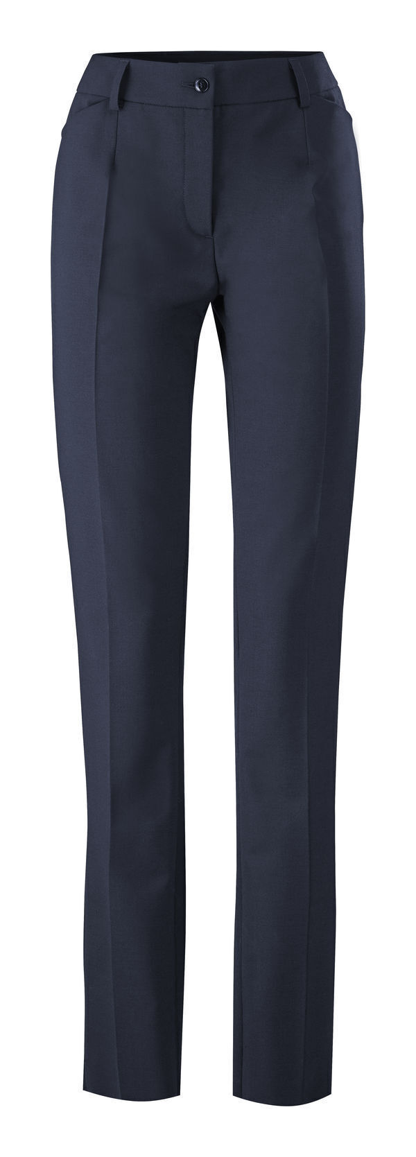 Pantalon femme taille ajustée. Ceinture avec 1 bouton plat. 5 passants ceinture. 2 poches cavalières sur le devant et 2 poches passepoilées dos avec simple passepoil. Plis cassés sur le milieu de jambes devant et dos. Bas intérieur ceinture terminé par un passepoil rouge. Coupe droite. Semi doublé devant. Bas non fini. Coupe ajustée. E.J. : 90 cm.