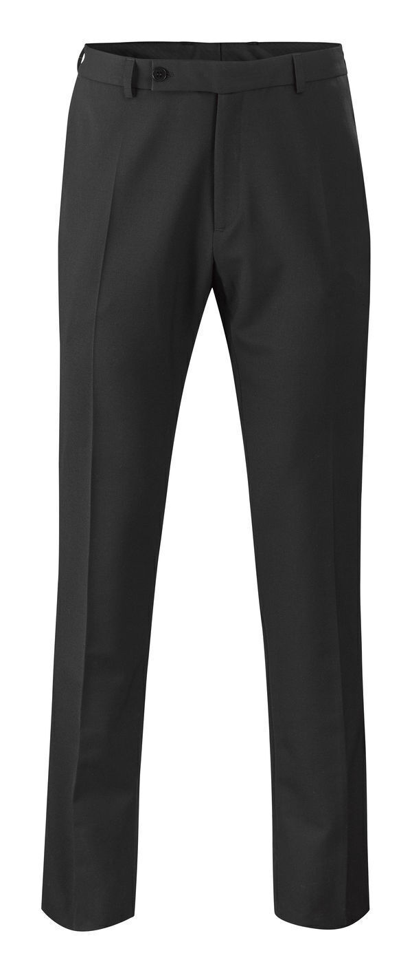 Pantalon homme. Ceinture avec 1 bouton plat. 6 passants ceinture. 2 poches italiennes sur le devant et 2 poches passepoilées. Dos avec simple passepoil. Plis cassés sur le milieu de jambes devant et dos. Bas intérieur ceinture terminée par un passepoil rouge. Coupe droite. E.J. : 90 cm.
