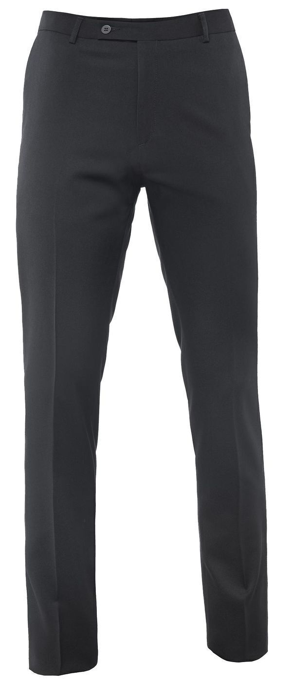 Pantalon costume homme. Ceinture 5 passants fermée par 1 bouton et 1 crochet. Braguette à glissière. Poches italiennes. 2 poches dos fermées par bouton. Coupe droite. Bas de jambe non fini. E.J. : 90 cm.