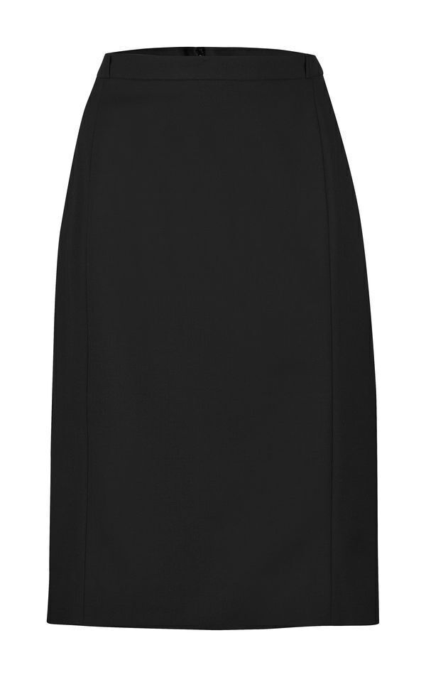 Jupe droite. Fine ceinture avec 6 passants. Fermeture par zip milieu dos et crochet. Découpes côtés. Fente dos avec point d’arrêt. Entièrement doublée. Longueur : 53 cm
