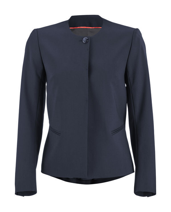 Veste femme courte à encolure ronde. Fermeture milieu devant par 3 boutons effet corne et sertis métal, dont 1 bouton apparent et 2 boutons cachés. 2 pinces poitrine. Découpe petit côté et milieu dos. Bas de manche avec fente à onglet et 3 boutons effet corne et sertis métal. 2 poches devant avec double passepoil. Veste entièrement doublée avec plis d’aisance et finitions intérieures passepoil rouge. Coupe trapèze.