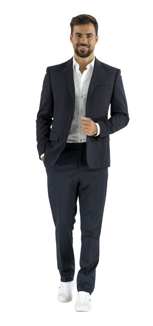 Veste costume homme. 1 boutonnière au col. 2 poches basses double passepoil à rabat. Fermeture 2 boutons milieu devant. Poche poitrine oblique. 1 fente milieu dos. 3 poches intérieures. Manches longues avec fente et boutons boutonnières. Entièrement doublée.