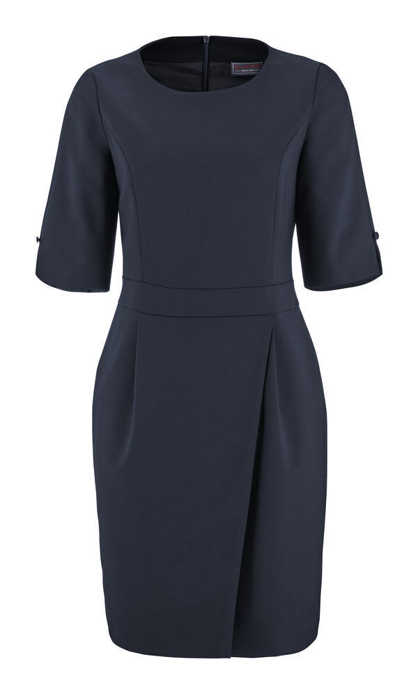 Robe faux portefeuille avec découpe taille. Fermeture par zip invisible milieu dos. Découpes princesse devant et dos s'arrêtant à la ceinture. 2 plis sur le devant. 2 pinces taille au dos. Bas de manches avec fente et dessous en satin pour un effet contrasté porté retourné. Boutons boule sur le haut de la fente effet bijou. Fente dos avec surpiqûre de renfort. Entièrement doublée.