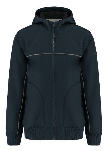 Veste softshell 3 couches bicolore. Capuche réglable par cordons élastiqués. Fermeture à glissière ton sur ton. Bande de propreté contrastée. 2 poches latérales avec fermeture à glissière. Porte-stylo élastiqué sur manche gauche. Bord-côte sur bas de manches et taille. | Passepoil contrasté entre les parties bicolores poitrine, manche, devant et dos. Biais contrasté