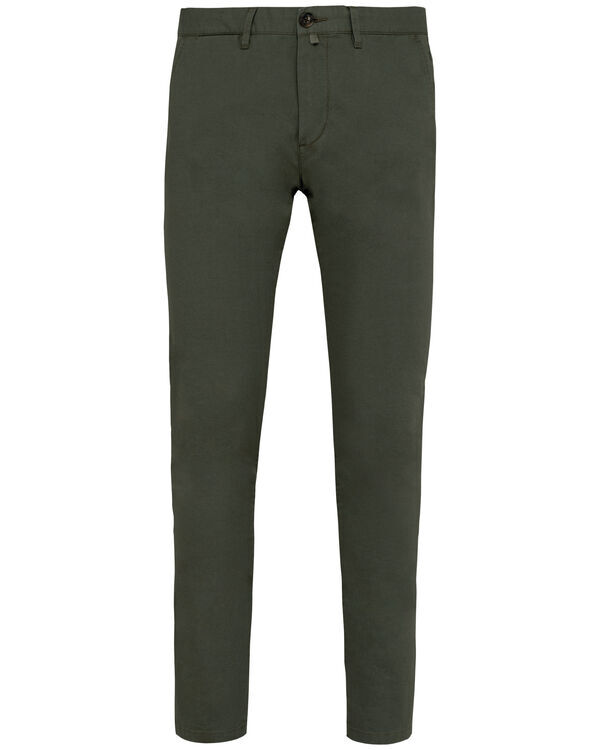 Pantalon chino. Fermeture braguette zippée et bouton cousu. Ceinture avec 5 passants. 2 poches italiennes. 2 poches arrières passepoilées. Ourlet invisible et fentes côtés. Coupe moderne. Finition peau de pêche.