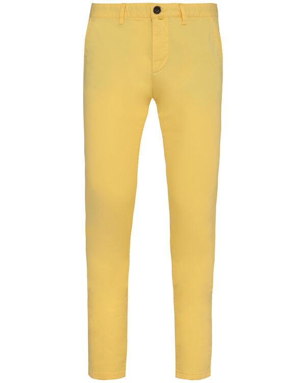 Pantalon chino. Fermeture braguette zippée et bouton cousu. Ceinture avec 5 passants. 2 poches italiennes. 2 poches arrières passepoilées. Ourlet invisible et fentes côtés. Coupe moderne. Finition peau de pêche.