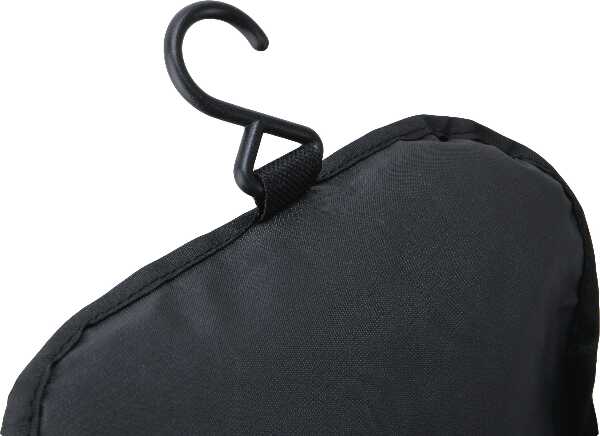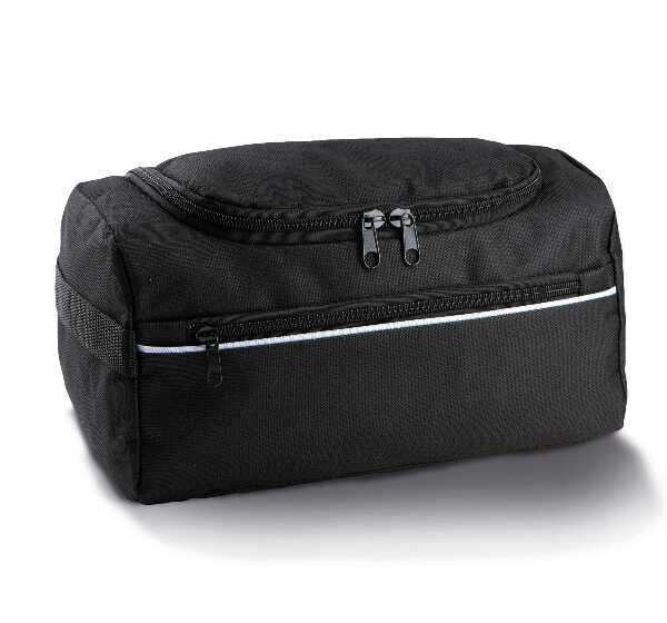 Trousse de toilette en polyester 600D, rabat sur le dessus équipé d'un crochet de suspension, poche intérieure, grande poche devant, poignée côté.