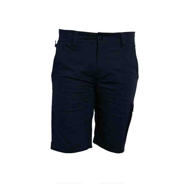 Bermuda stretch. Ceinture fermée par bouton et zip. Poches italiennes avec poche zippée côté droit au porter. Poche cuisse avec soufflet fermée par rabat avec auto-agrippant. Poche mètre. 2 poches arrière plaquées dont une fermée par rabat avec auto-agrippant. Renfort d'entrejambe. Triple surpiqûres à l'entrejambe. Rehausse dos. | Mercerie tout plastique. E.J. : 27 cm.