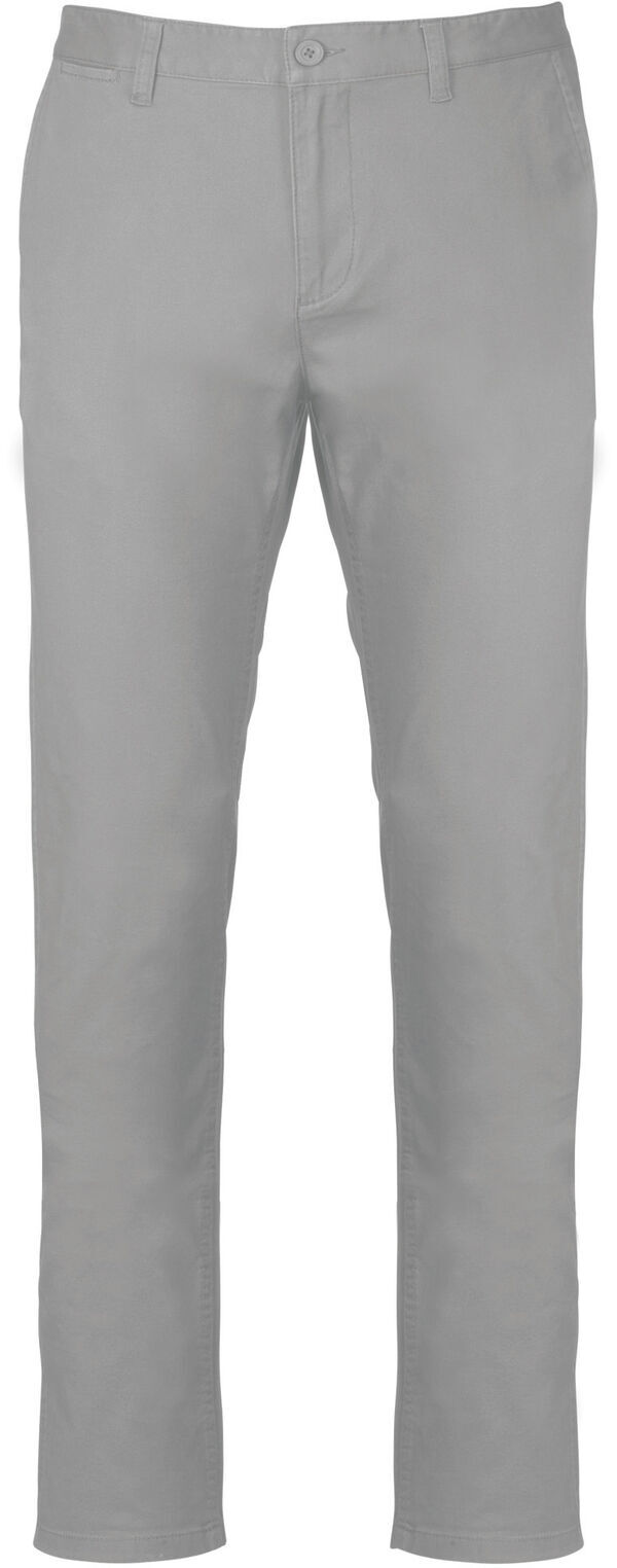 Pantalon chino homme. Ceinture fermée par un bouton et zip. 2 poches italiennes côtés dont une avec poche ticket. 2 poches passepoilées arrières. | Finition aux enzymes.