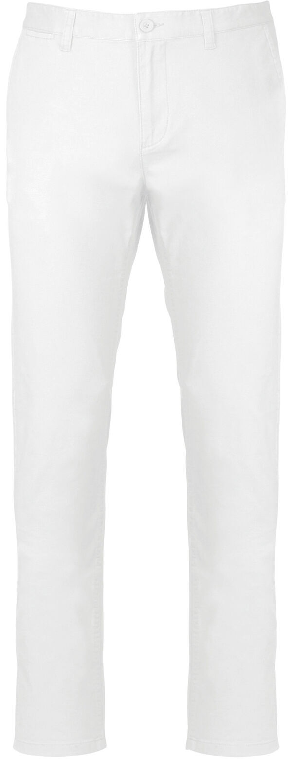 Pantalon chino homme. Ceinture fermée par un bouton et zip. 2 poches italiennes côtés dont une avec poche ticket. 2 poches passepoilées arrières. | Finition aux enzymes.
