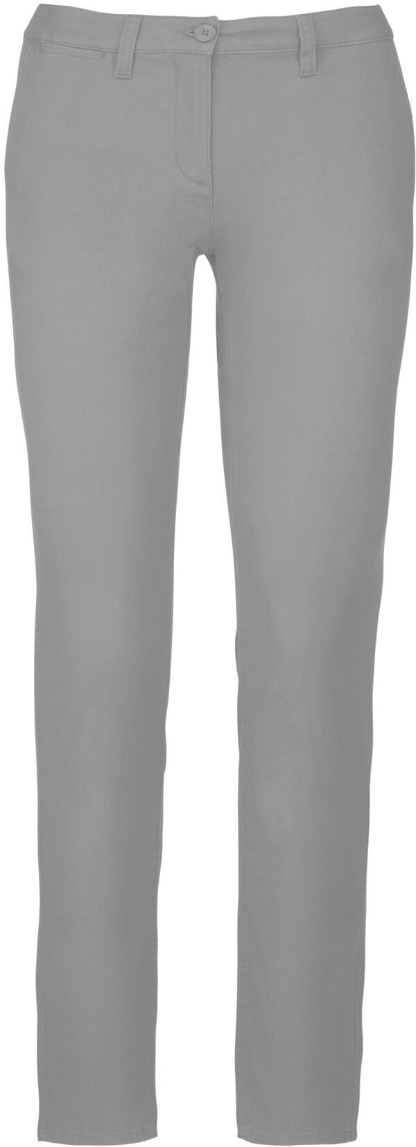 Pantalon chino, coupe femme. Fermeture braguette zippée et bouton cousu. Ceinture avec passants. 2 poches italiennes côtés, dont une avec 1 poche monnaie, 1 poche ticket. 2 poches arrières passepoilées avec piqûre de renfort. Coupe moderne. Finition enzymes.