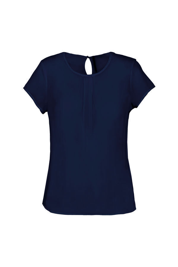 Blouse femme en crêpe. Encolure ronde avec biais. Petites fronces à l'encolure devant. Fermeture à l'arrière par 1 bouton recouvert.