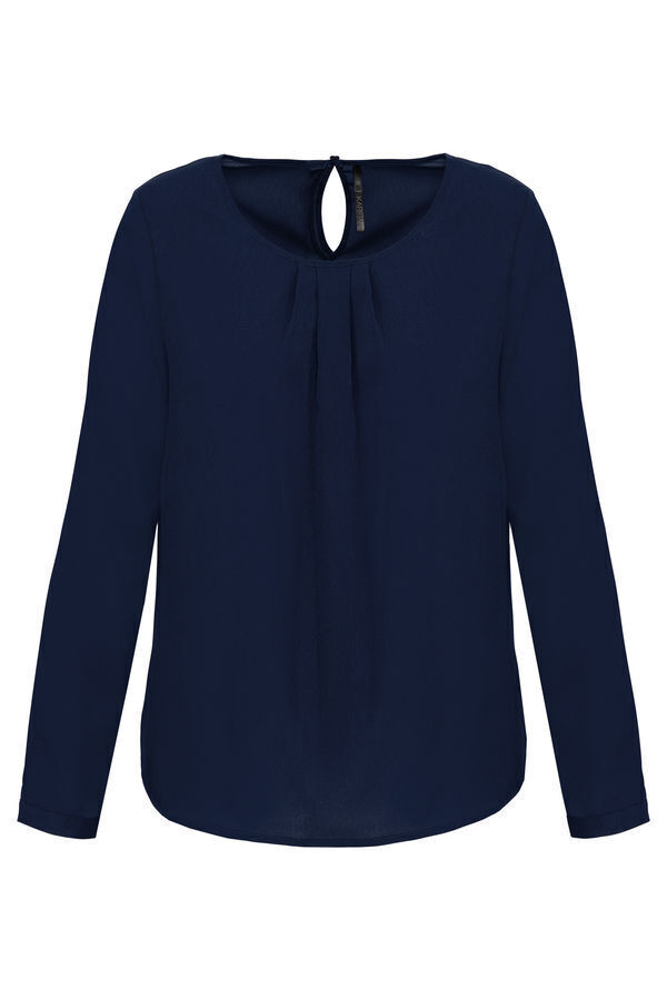 Blouse femme en crêpe. Encolure ronde avec biais. Petites fronces à l'encolure devant. Fermeture à l'arrière et au bas de manches par 1 bouton recouvert.